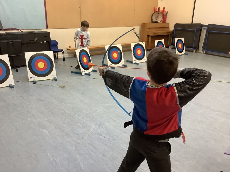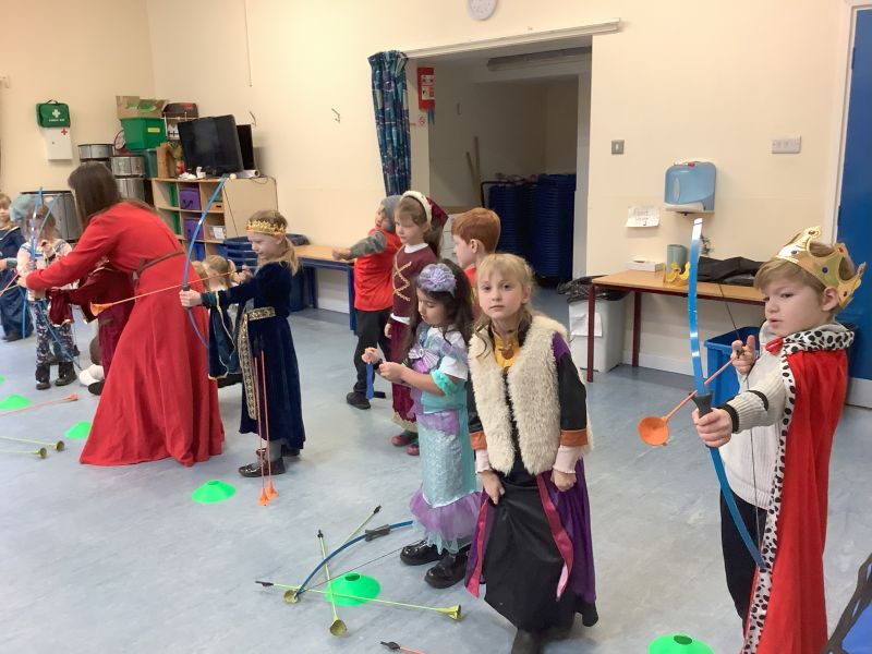 They are history re-enactors, and they told the children all about medieval clothes and the weapons that people living in a castle would have used. We then spent the rest of the morning making hobby horses and shields ready for our medieval tournament. We had an archery competition, had a go at jousting with our hobby horses and then we had to slay the dragon by throwing spears at it!