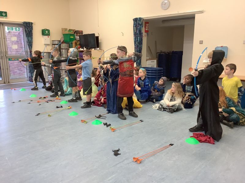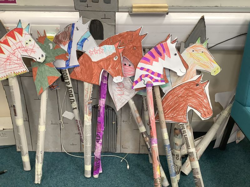 They are history re-enactors, and they told the children all about medieval clothes and the weapons that people living in a castle would have used. We then spent the rest of the morning making hobby horses and shields ready for our medieval tournament. We had an archery competition, had a go at jousting with our hobby horses and then we had to slay the dragon by throwing spears at it!