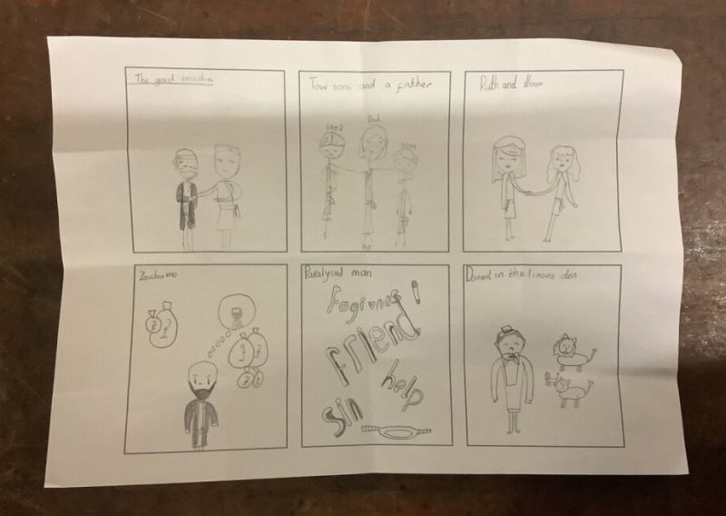 We started the day with Collective Worship led by Ziggy, who shared the big story of the bible and explained the activities for the day. The children started by looking at the Frieze as a whole timeline of the bible. They were detectives and looked carefully at the panels on the frieze to find different bible characters and stories. We then shared some bible stories and mapped them onto our bible timelines.